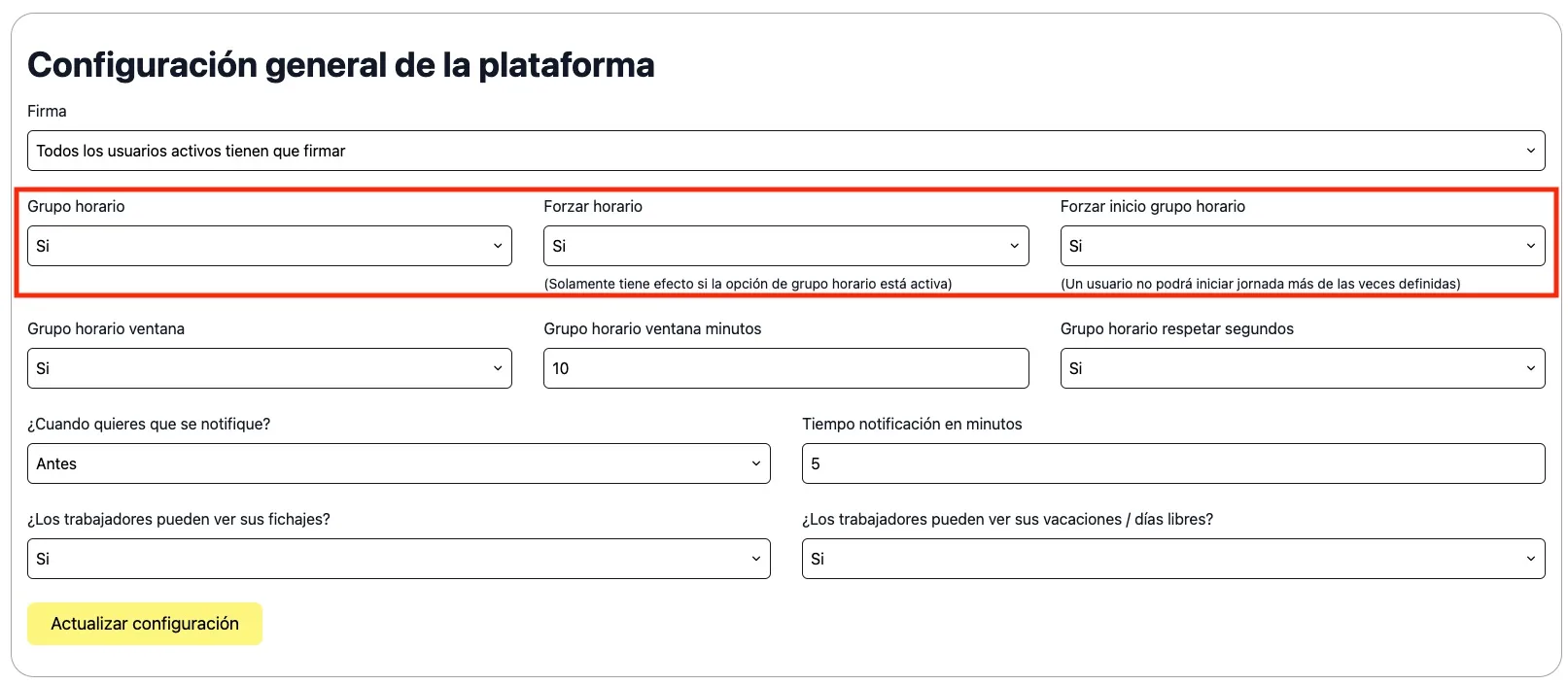 debe estar con el valor “Si” la opción “Grupo Horario”. No es necesario que esté la opción Forzar horario o Forzar