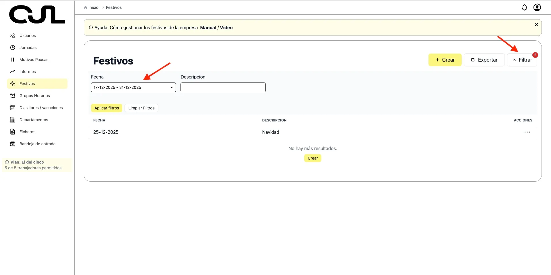 Una vez allí, veremos el listado de los festivos definidos. Podemos usar los filtros para: