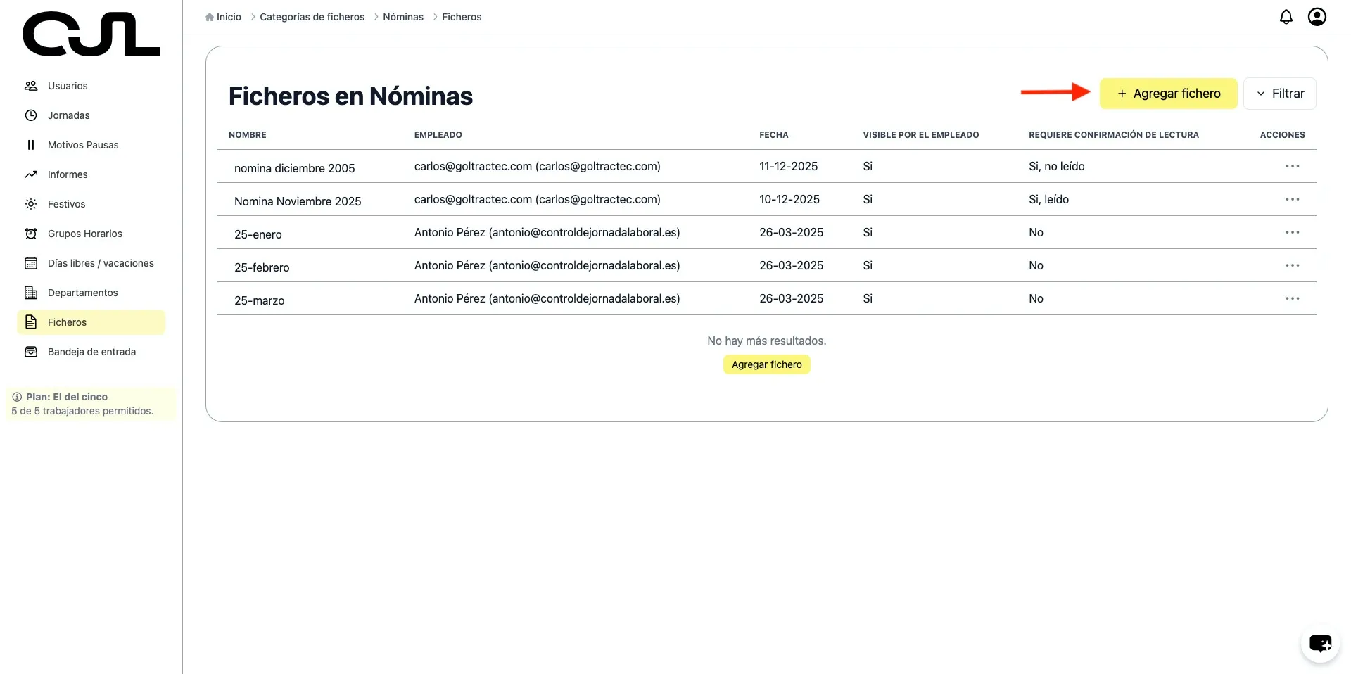 Por ejemplo, si estás en la carpeta Nóminas, que es visible para los trabajadores y quieres subir una nómina para un empleado, simplemente pulsa en “Agregar fichero”, selecciona el trabajador y el archivo, y confirma con “Subir fichero”.