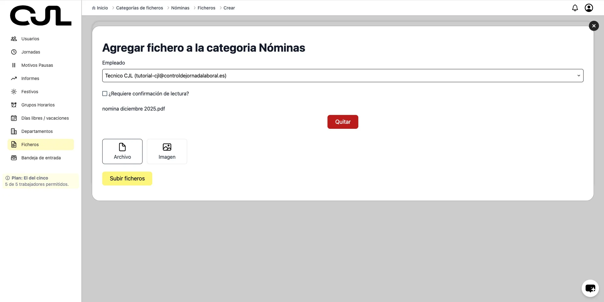 Esta funcionalidad de ficheros solo está disponible para los planes de más de 2 trabajadores.
