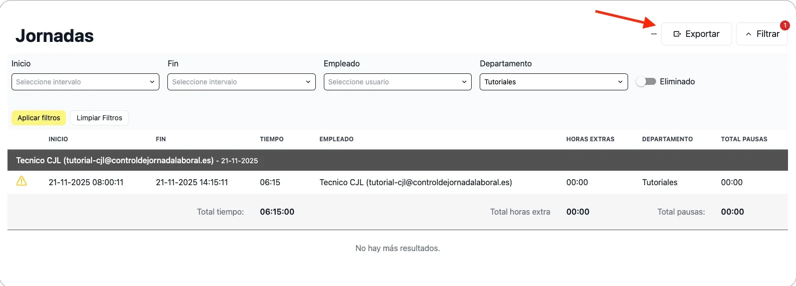 Para acceder al listado de jornadas de tu empresa simplemente tienes que ir al menú y clicar en la opción Jornadas. Ahí verás un listado de los fichajes realizados por los trabajadores y ordenado por fecha (desde la fecha más actual a la más antigua). Los fichajes de un trabajador se agrupan por día.