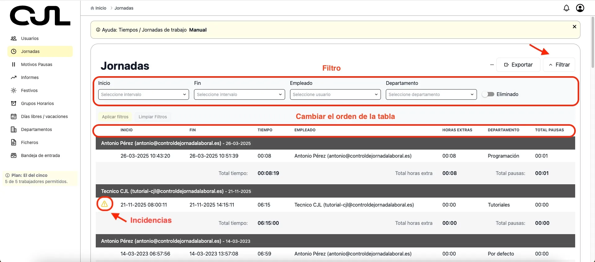Para acceder al listado de jornadas de tu empresa simplemente tienes que ir al menú y clicar en la opción Jornadas. Ahí verás un listado de los fichajes realizados por los trabajadores y ordenado por fecha (desde la fecha más actual a la más antigua). Los fichajes de un trabajador se agrupan por día.